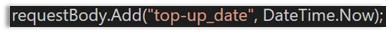 If any of the property names (string values on the left-hand-side of ‘:’) in our objects contain characters that are not alpha-numeric or ‘_’, then we must add these properties using the Add() method. For example, if we were adding a datetime property named “top-up_date”, we must call Add() because the property name contains a hyphen.